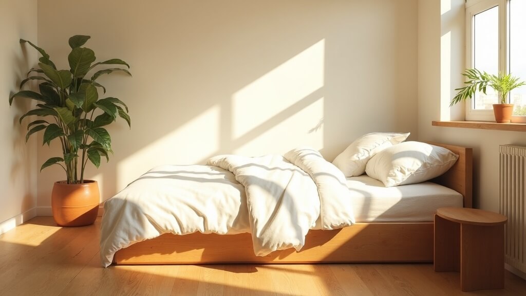 Luz, fibras y tonos neutros. Manta de lana gruesa y madera clara para una decoración de dormitorios acogedora.