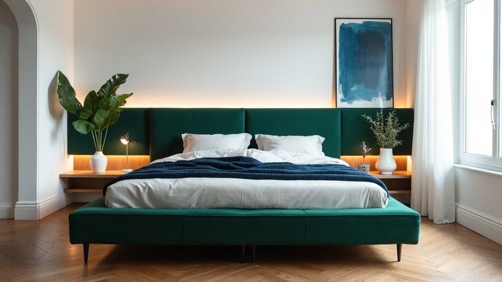 Azul petróleo o índigo en pared cabecero con moldura fina. Contrasta con madera para una decoración de dormitorios sofisticada.
