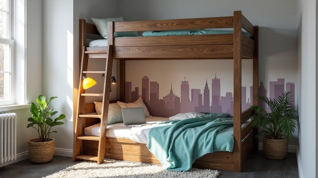 Litera triple o litera+nido; armario alto y maleteros sobre puertas. Mantén paleta neutra para una decoración de dormitorios ordenada.