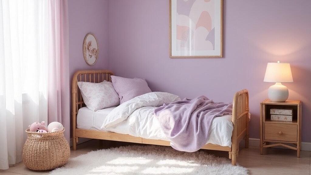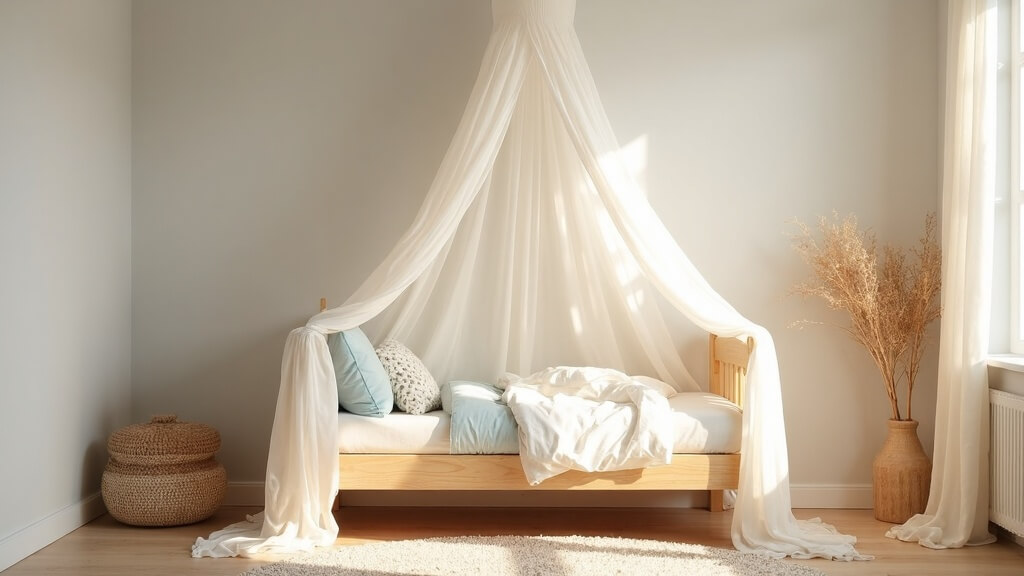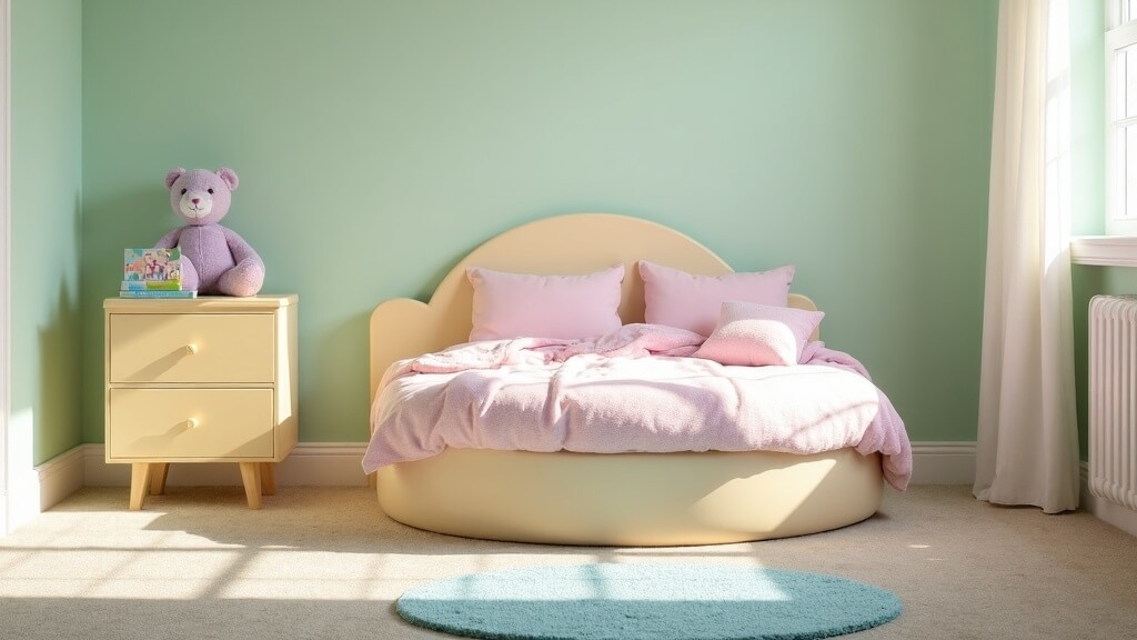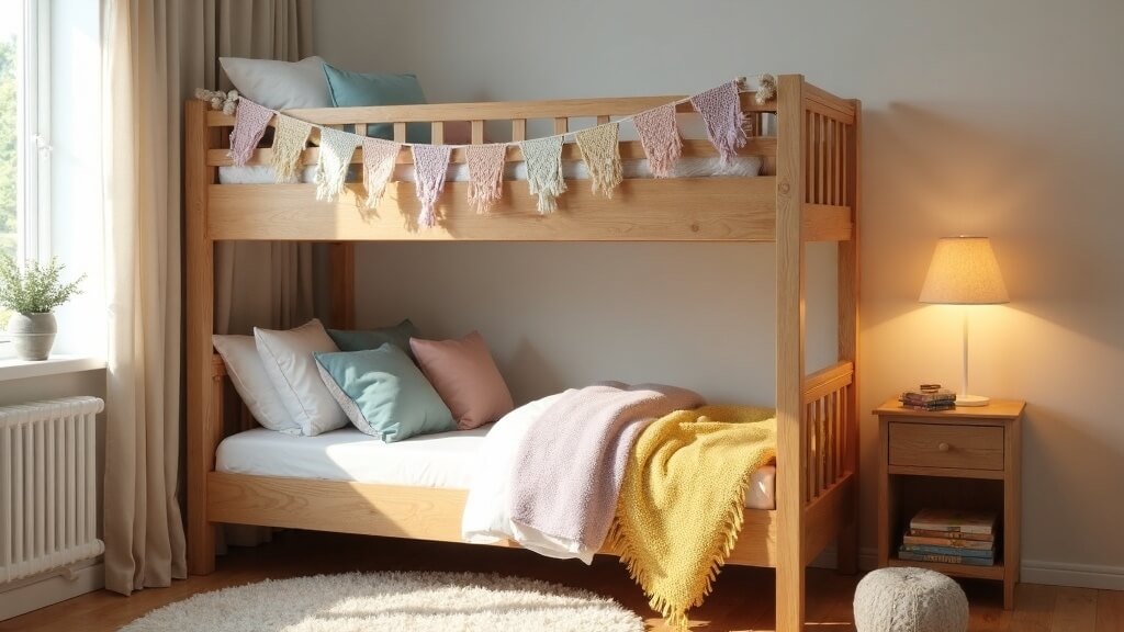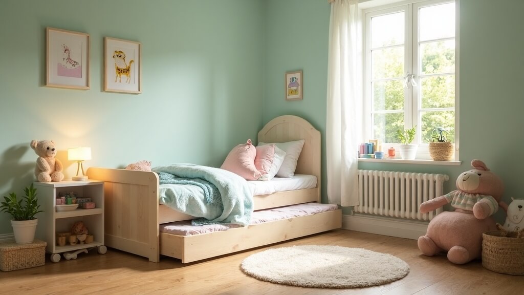 Altura baja y barandas seguras. Textiles lavables y colores suaves para una decoración de dormitorios dulce.