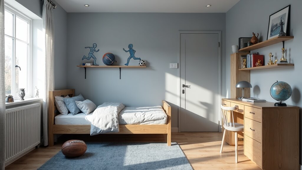Azules grisáceos con madera clara, almacenamiento deportivo en cestas y escritorio robusto. Un mapa mural educa y viste la decoración de dormitorios con carácter aventurero.