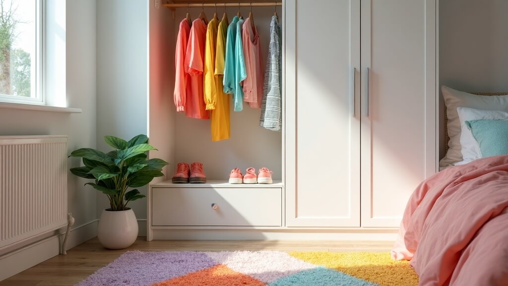 Un armario esquinero y estantes sobre puerta aprovechan huecos olvidados. Opta por una alfombra lavable que aporte color a la decoración de dormitorios sin exigir mantenimiento.