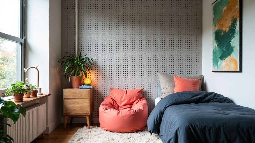 Define tres zonas en uno: dormir, estudiar, guardar. Panel perforado sobre el escritorio para colgar accesorios y liberar mesa. Así respira la decoración de dormitorios.