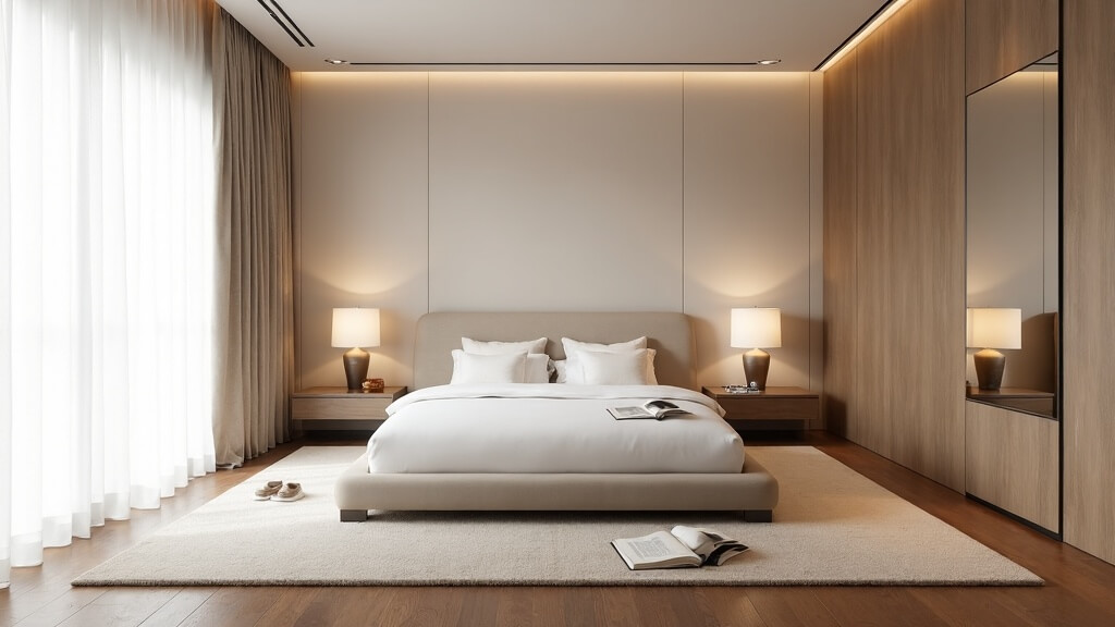 Panelado acústico detrás del cabecero, domótica de luces cálidas y ropa de cama de 300 hilos. La decoración de dormitorios se siente como un hotel sereno.