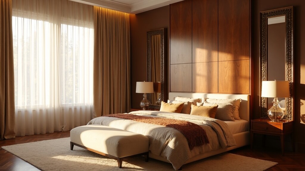 Cama con canapé, cabecero alto, armario a medida y cómoda con organizadores. Apliques regulables y cortinas dobles sellan una decoración de dormitorios cómoda y silenciosa.