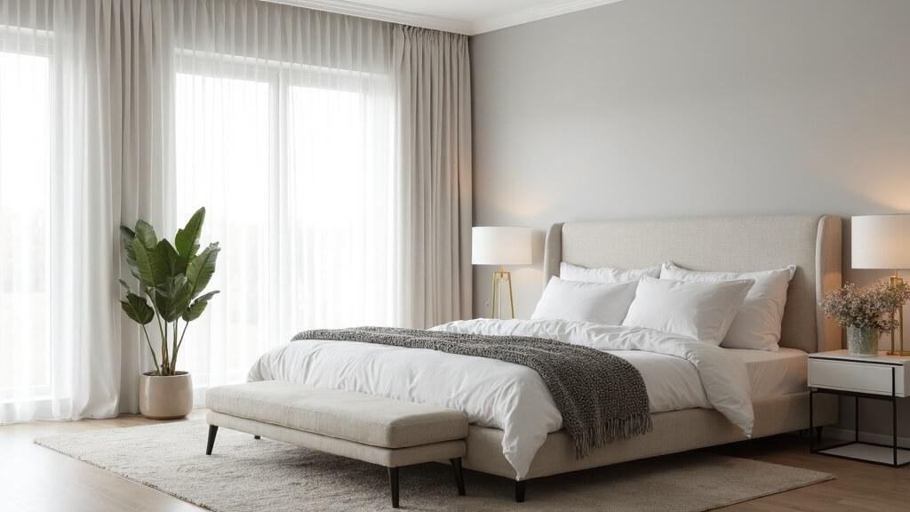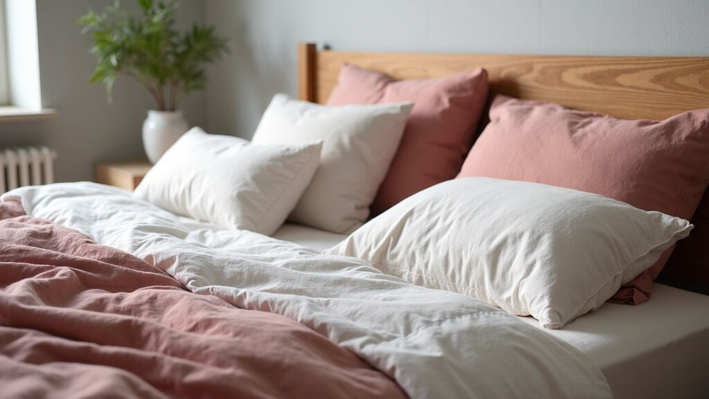 Lino lavado o bouclé en tonos piedra; confort inmediato para la decoración de dormitorios.