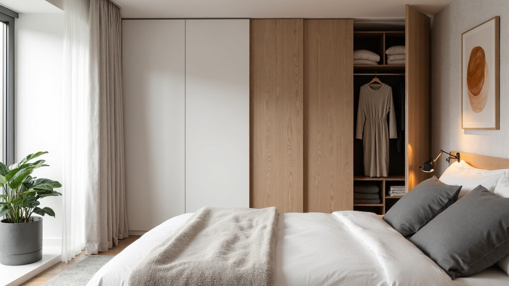 Abierto si eres ordenado; cerrado si buscas calma total. Iluminación interior y espejo de cuerpo entero completan la decoración de dormitorios funcional.