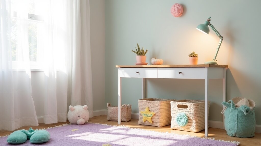 Incluye cama, armario, escritorio y zona de juego delimitada por una alfombra. Cestas etiquetadas facilitan el orden y la decoración de dormitorios se mantiene serena.
