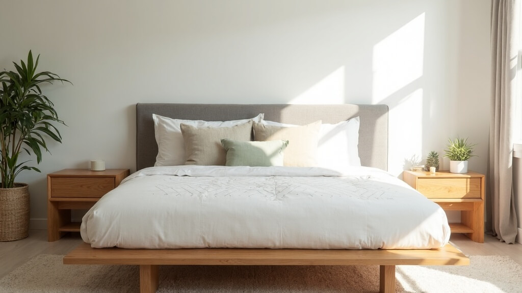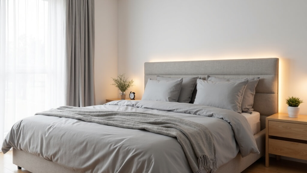 Combina roble, gris suave y blanco tiza; añade una manta de punto grueso y una lámina en formato XL sobre la cama. Integrar tiras LED en el cabecero multiplica la luz y estiliza la decoración de dormitorios sin cables a la vista.