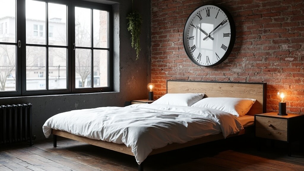 Metal negro, madera envejecida y textiles de lino. Iluminación de brazo articulado en la decoración de dormitorios urbana.