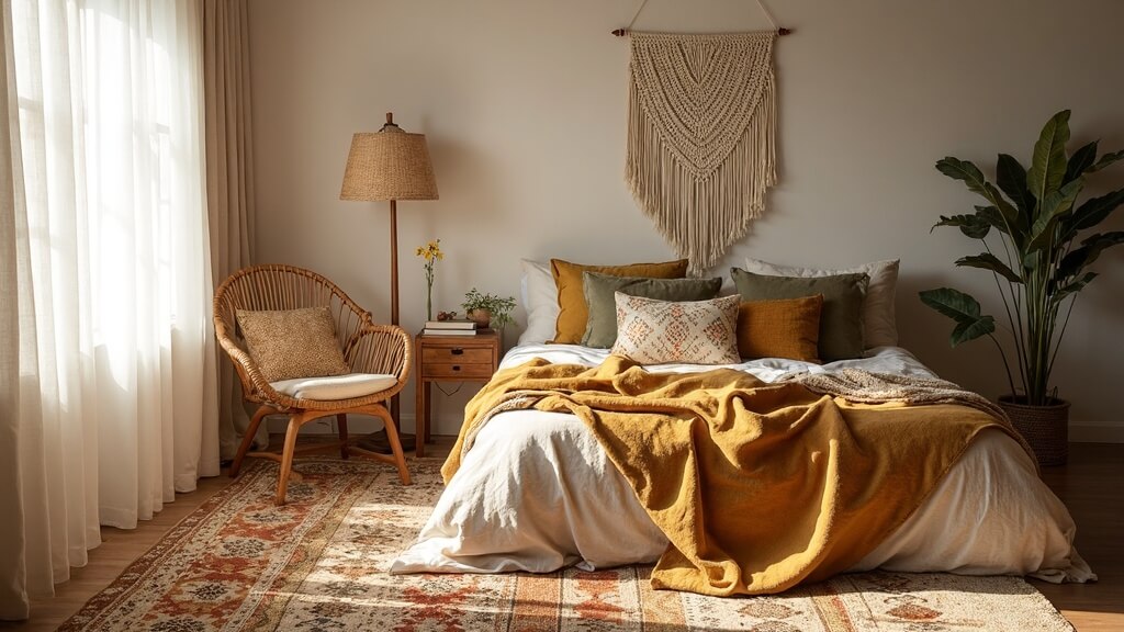 Capas de textiles, alfombras de yute y lámparas de mimbre. Color desaturado y ritmo libre en la decoración de dormitorios.
