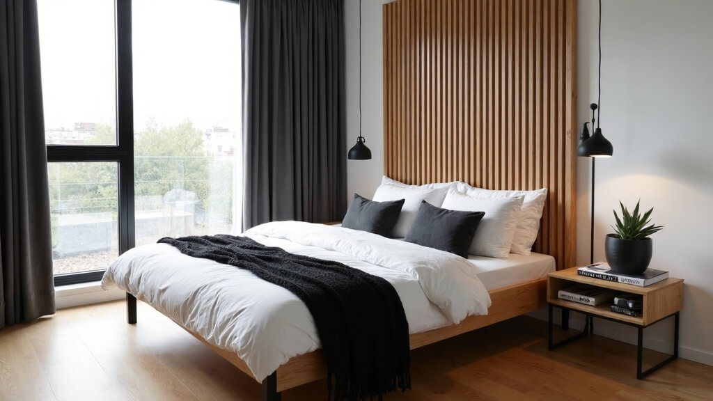 Líneas rectas, perfiles negros y madera natural. Un cabecero panelado en listones verticales alarga la pared y ordena visualmente. La decoración de dormitorios moderna pide luz cálida y textiles lisos con algún acento gráfico.