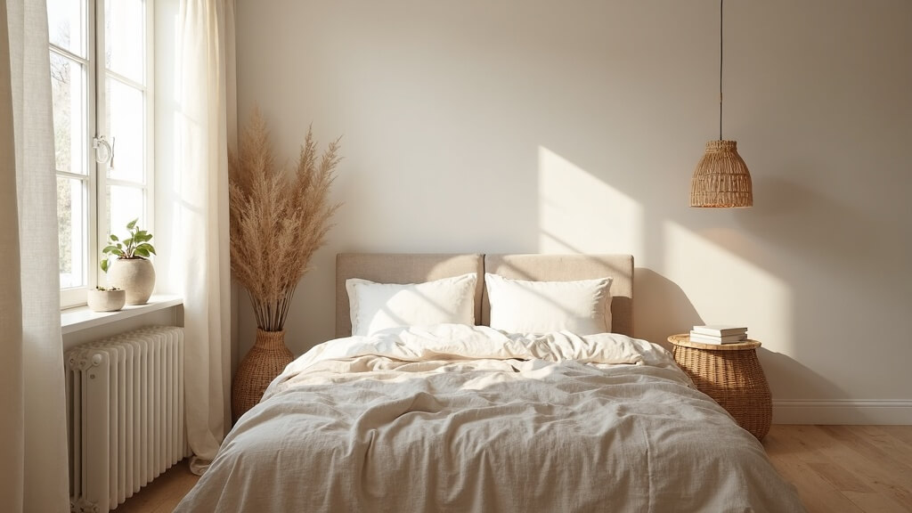 Pinta paredes en tonos claros mate y reserva el color para textiles y cojines. Las cortinas en lino fino filtran la luz como un velo. Un plaid en bouclé crema y cojines en algodón lavado suman textura amable y sensación de hogar.